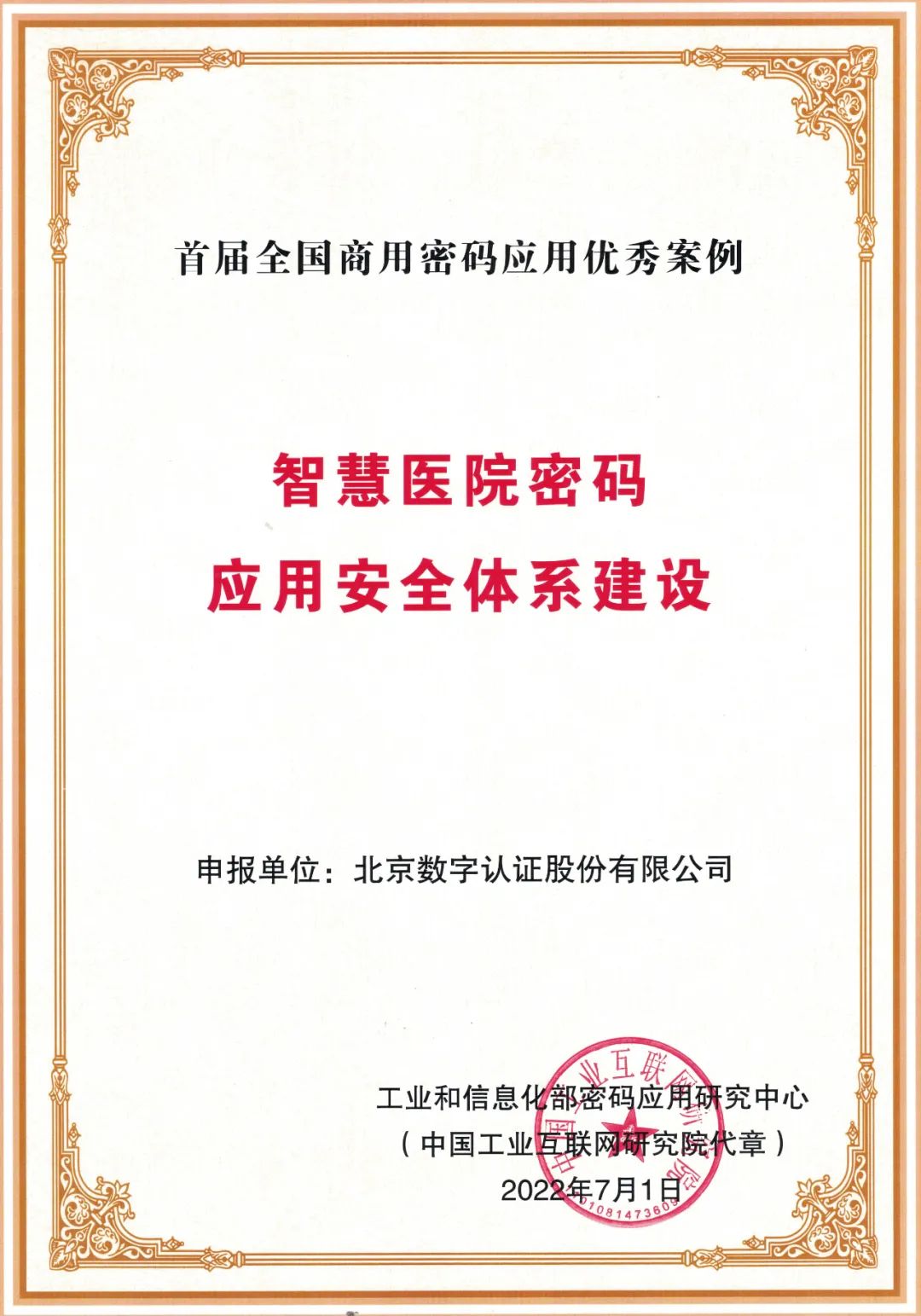 工信部“首届全国商用密码应用优秀案例”结果公示,数字认证智慧医院密码建设获奖