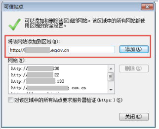 6)在"将该网站添加到区域"处,录入:"需要登录的系统网址(可直接复制系统网站粘贴)"如下图示例: